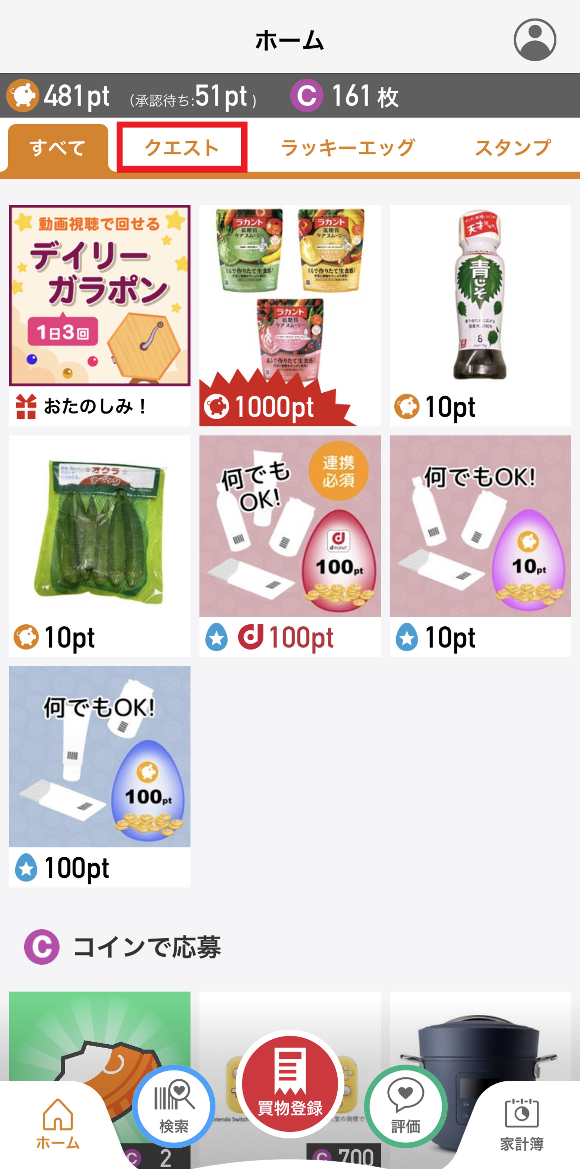 1.ホーム画面で「クエスト」をタップ