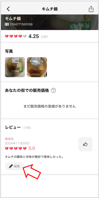 - 商品の詳細ページに遷移するので、ご自身のレビューの下にある編集をタップ
