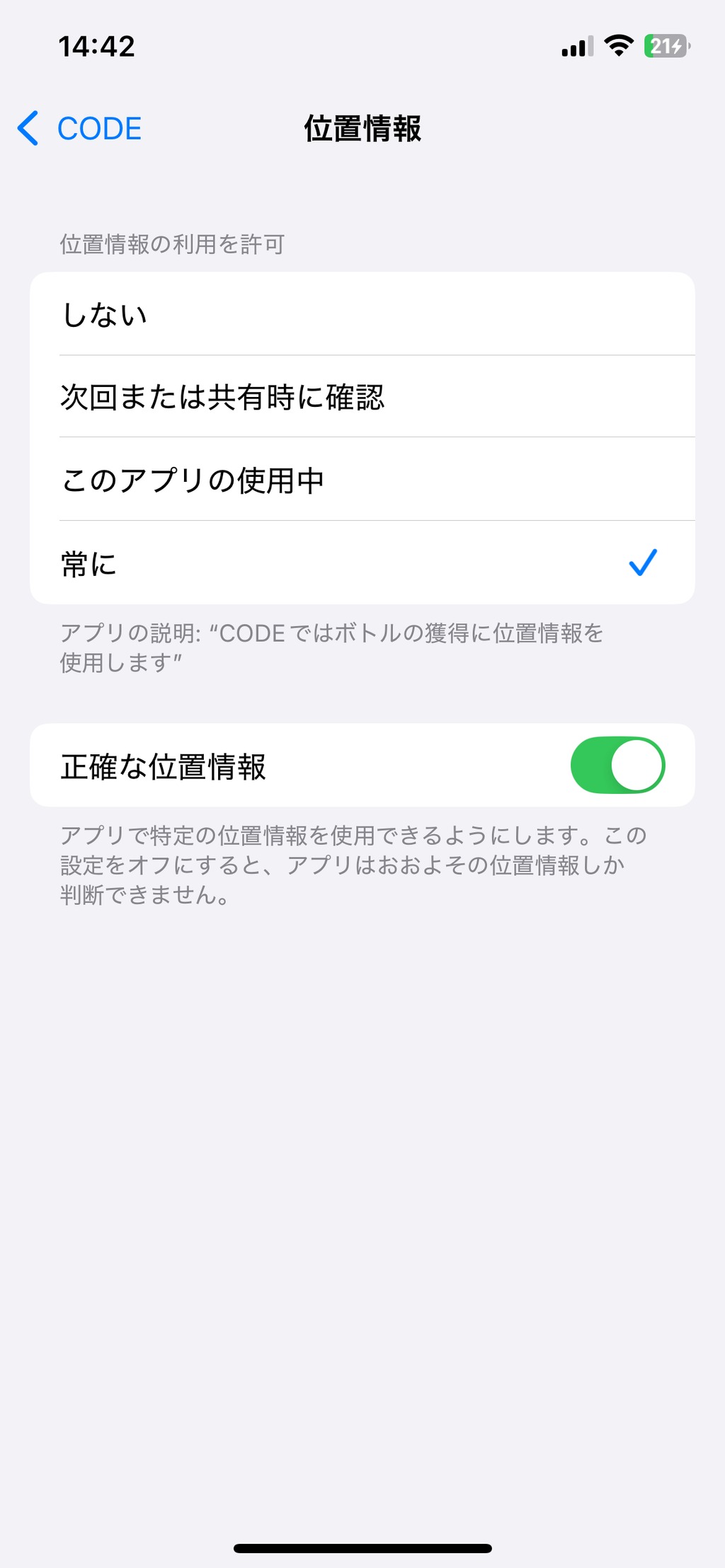 - 更に下にスクロールしてCODEをタップし、「常に」が選択されていることを確認