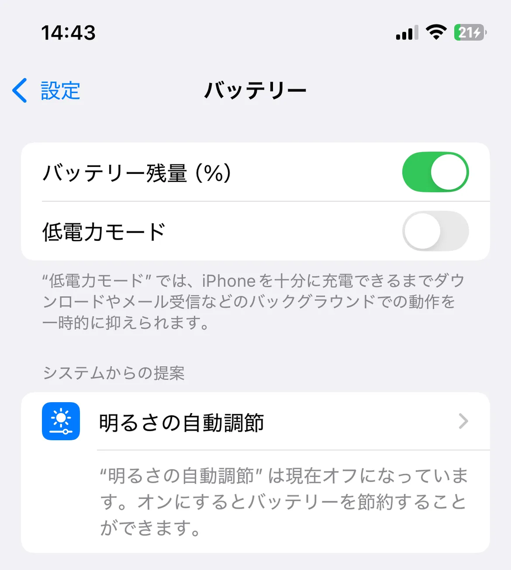 スマートフォン本体の設定アプリでバッテリーを選択し、低電力モードがOFFになっていることを確認