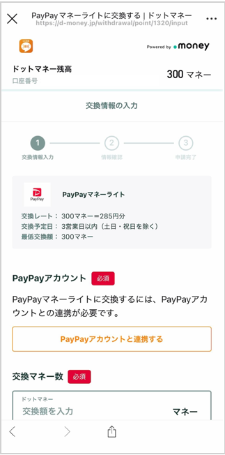 - ドットマネーから各交換先サービスへ交換したいマネー数を入力し、交換申請を進める