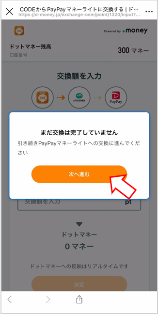 - 「まだ交換は完了していません」のポップアップが出現するため、次へ進むをタップ