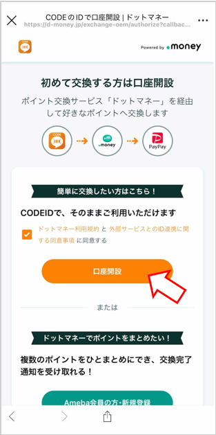 ※ドットマネーのご利用が初めて場合は、CODEIDでご利用いただくと簡単に開設できます※すでにドットマネーの口座をお持ちの場合、Amebaアカウントを利用しID連携を行う必要がございます