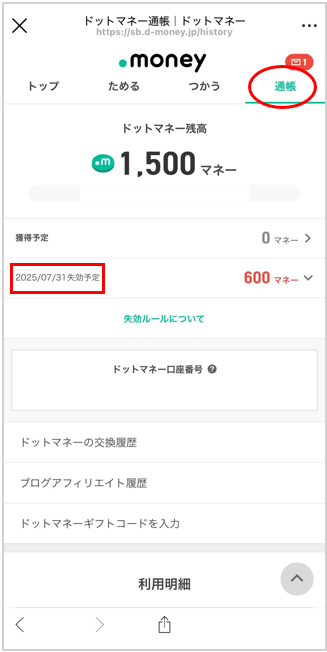 失効したマネーはご利用いただけません。なお、失効予定はドットマネー通帳にてご確認いただけます。