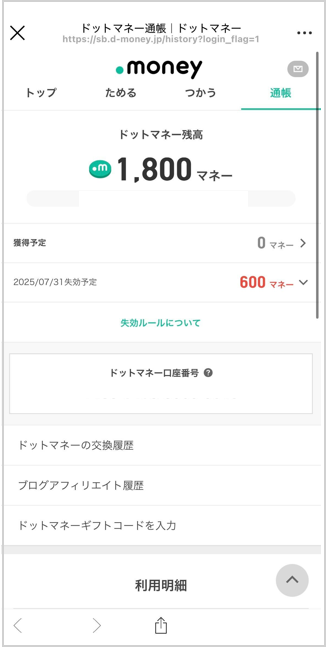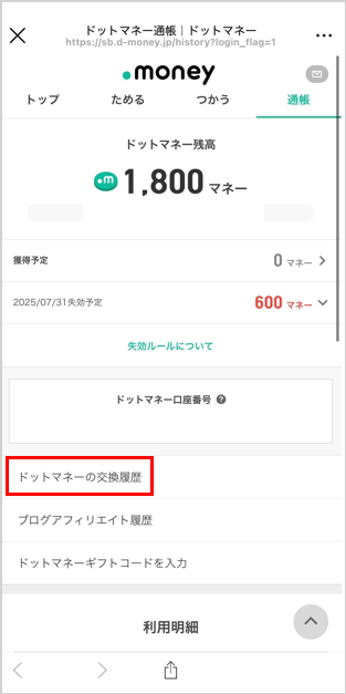 - ドットマネー通帳の画面に遷移し、ドットマネーの交換履歴をタップ