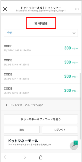 ドットマネーで交換履歴を確認 をタップで、ドットマネーの画面でCODEからポイントが交換された履歴を確認
