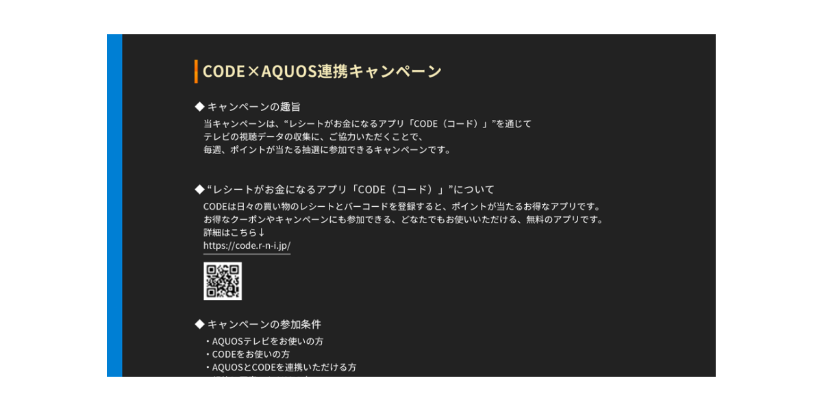 - CODEを開き、【ホーム画面右上のマイページ > 外部サービス連携 > AQUOSテレビ】をタップ