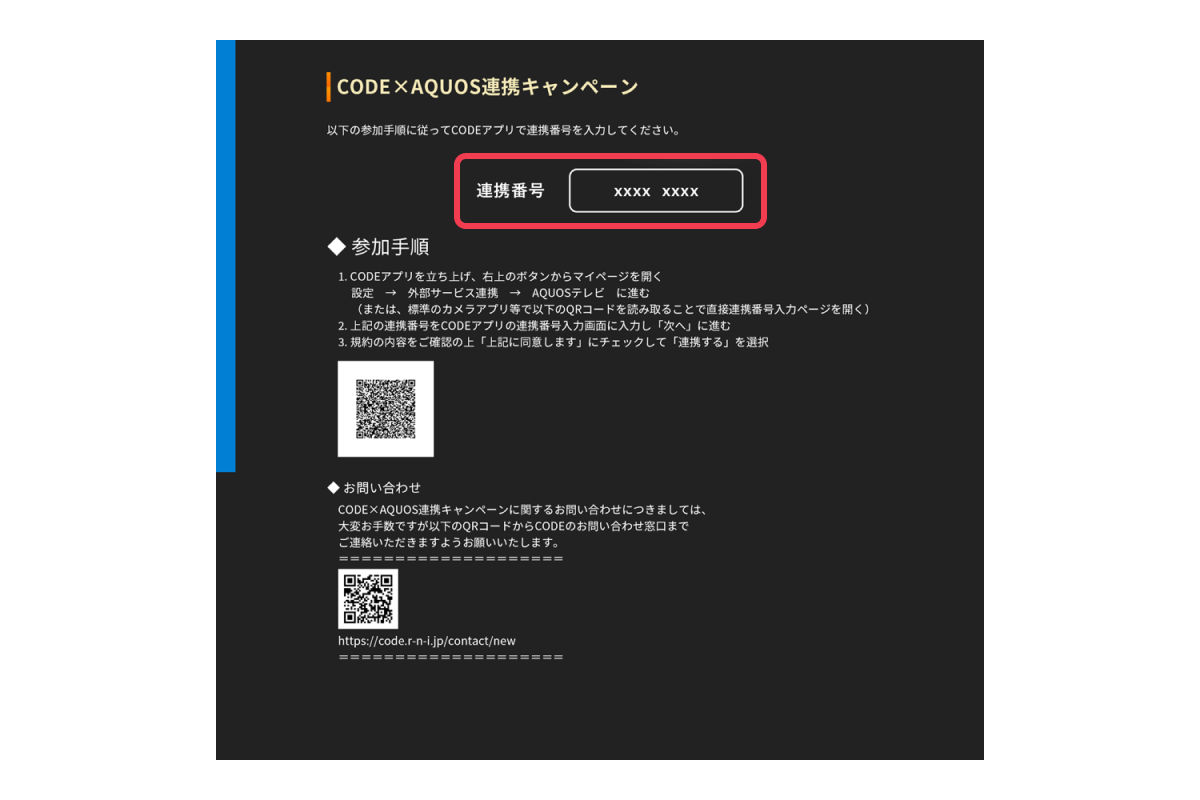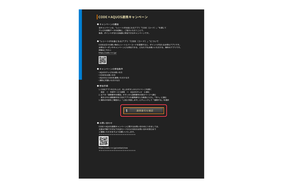 - キャンペーンページ内で、「連携番号を確認」を選択 または、端末のカメラを起動して表示されているQRコードを読み取ることで、お使いのCODEに自動で連携番号が入力されます(←の場合は手順17へ)