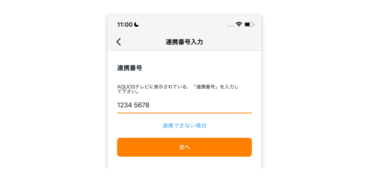 - 連携番号入力画面で、テレビに表示されている8桁の連携番号を入力し、「次へ」をタップ