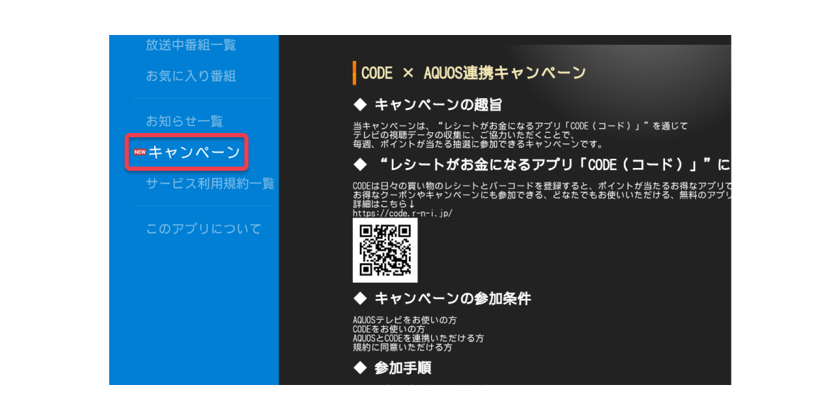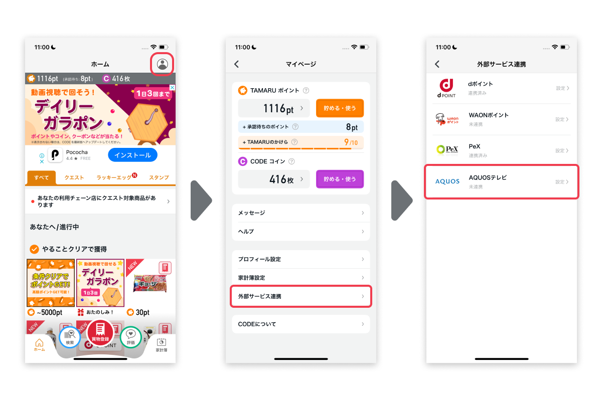- CODEを開き、【ホーム画面右上のマイページ > 外部サービス連携 > AQUOSテレビ】をタップ